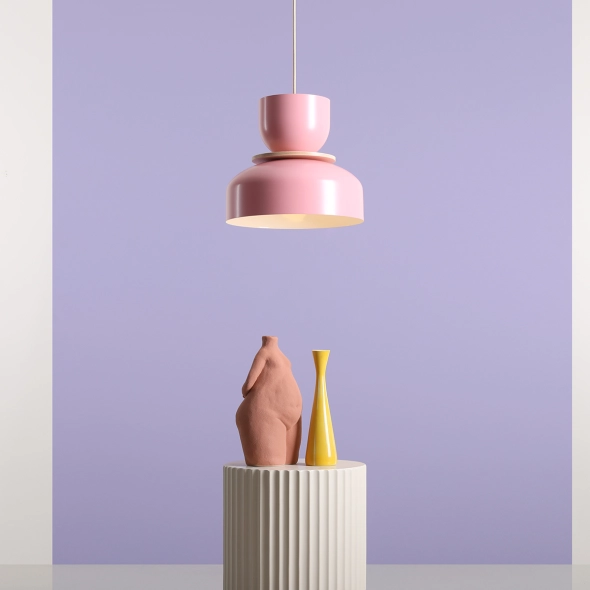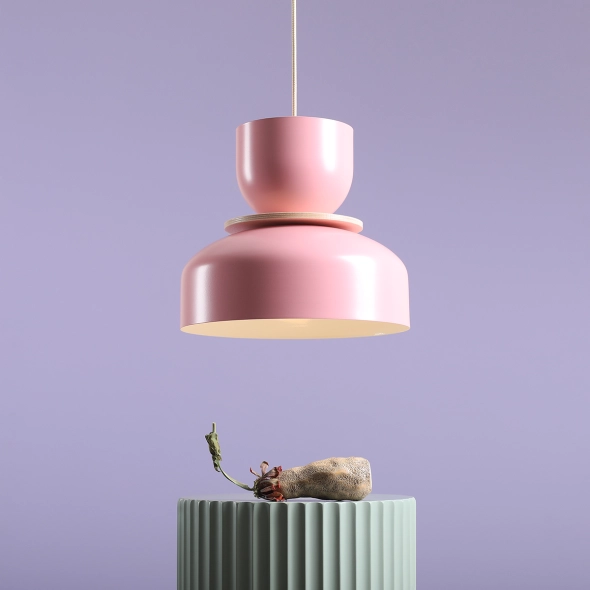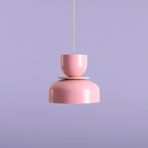 Lampa wisząca Uto złożona z trzech niezależnych modułów, wykończona w delikatnym odcieniu różu. Wnętrze dużego klosza pomalowane jest na biało dzięki czemu odbite światło jest intensywne i dobrze rozproszone. Całość montowana na kremowym lub czarnym przewodzie w tekstylnym oplocie, a długość kabla można dowolnie skrócić. Drewniany dysk jest elementem dekoracyjnym i może, ale nie musi stanowić części lampy. Modułowa koncepcja produktu zakłada dowolność w montażu.